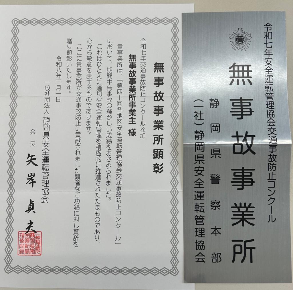 一般社団法人 静岡県安全運転管理協会より 無事故事業所顕彰をいただきました☆